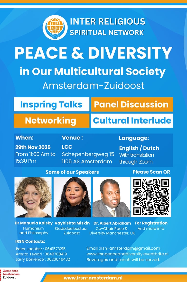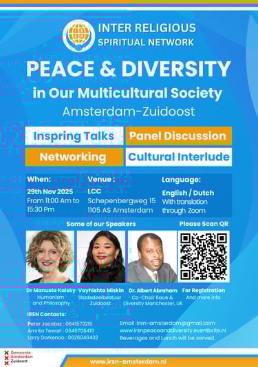 The new Inter Religious Spiritual Network (IRSN) is launching with an inaugural conference titled "Peace & Diversity in Our Multicultural Society" in Amsterdam Zuidoost. This event aims to bring together faith leaders, officials, and the community to address social divisions and foster collaboration for peace and inclusion.